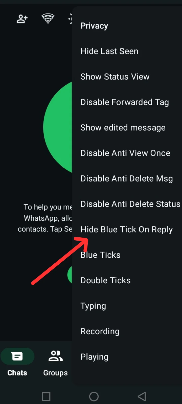 Read messages privately without showing blue ticks until you respond. This feature offers greater privacy control. Enable it in the Privacy section of FM Settings for discreet message reading.